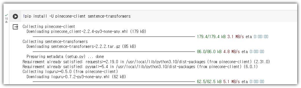pinecone-client, sentence-transformer 2개의 패키지 설치가 필요하다.