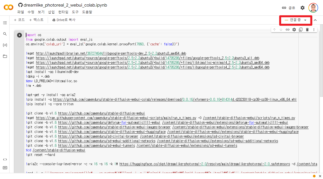 이쯤 했으면 Colab 실행 완료되었을테니, 계속 이어서 진행해보면 ...