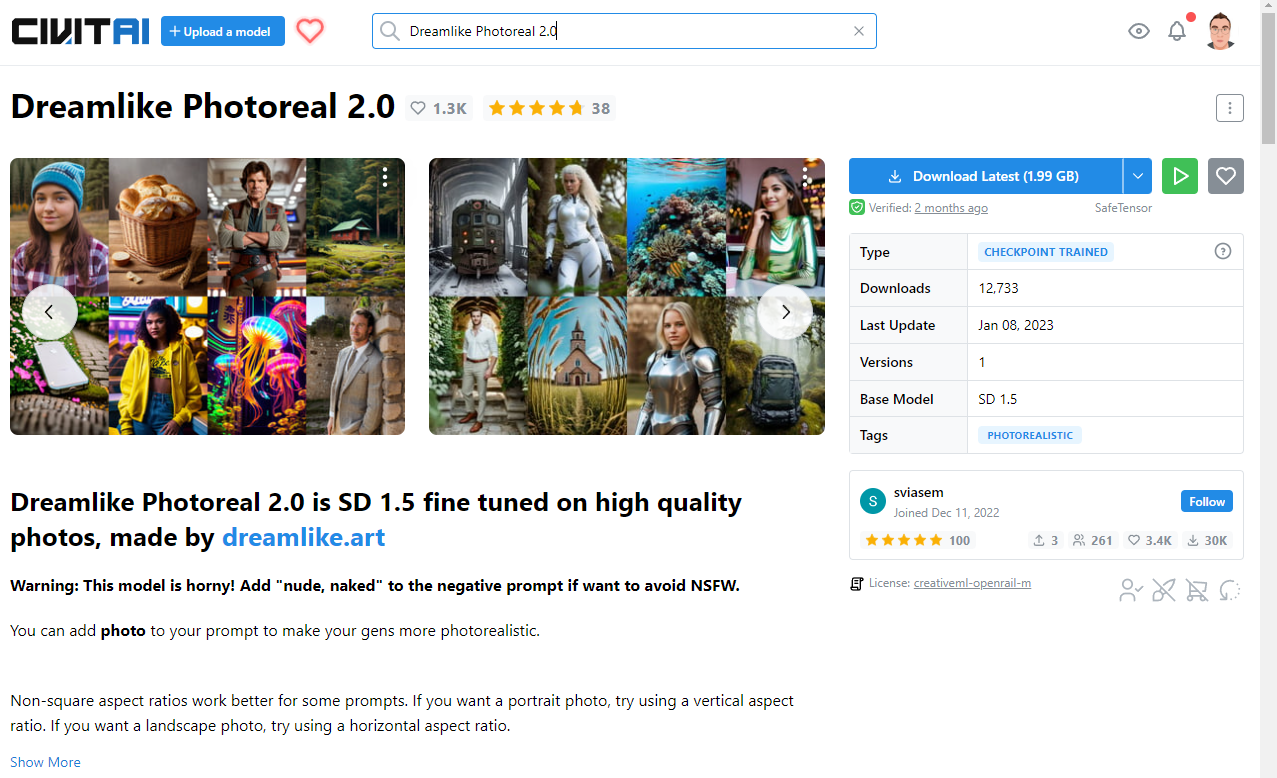 CIVITAI에서 우리가 선택한 "dreamlike photoreal 2.0"을 검색해보자.