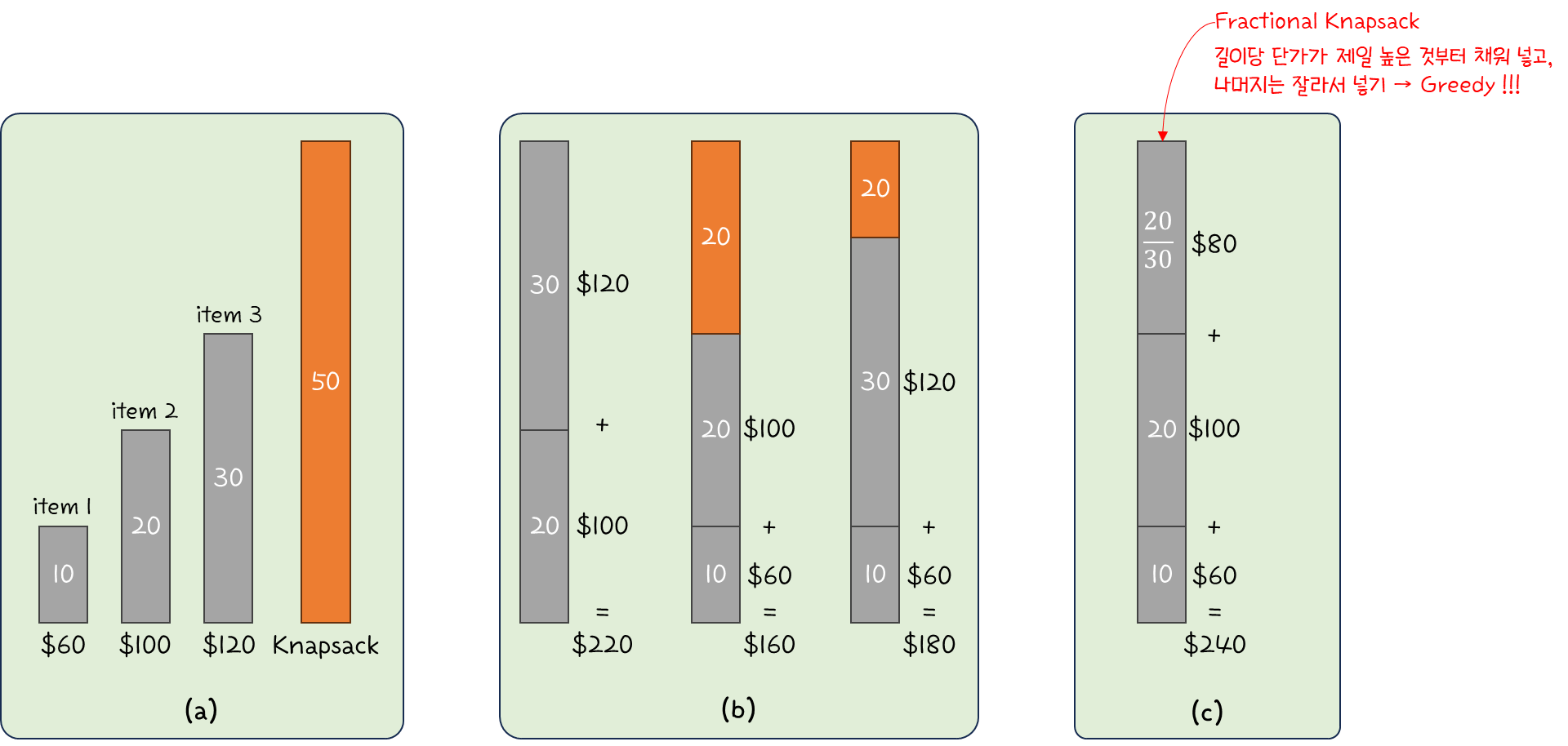 물건들의 가격과 무게가 모두 다르다고 했을 때, 어떻게 넣어야지 가장 비싸게 물건을 훔칠 수 있는지를 찾는 것이다.