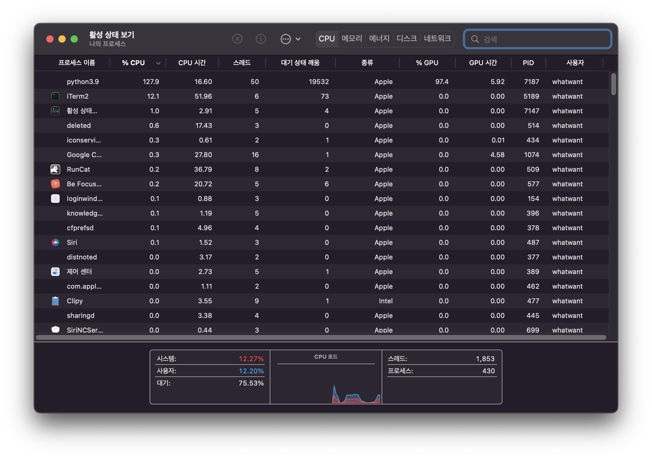 - 뭔가 에러 메시지가 나와서 예쁘지는 않는데... GPU는 사용하고 있다.