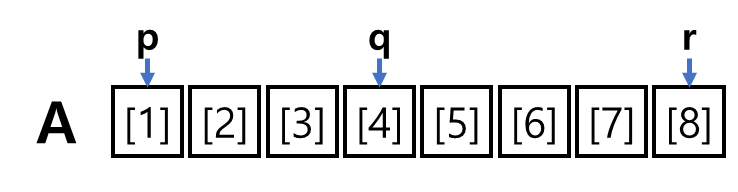 merge 작업을 할 시작 위치(p), 끝 위치(r), 그리고 divide를 할 중간값(q)이다.