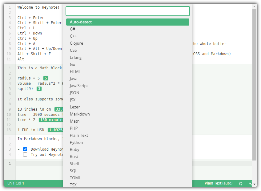 각 블록은 여러 유형의 Syntax Highlighting과 자동 포맷을 지원한다.