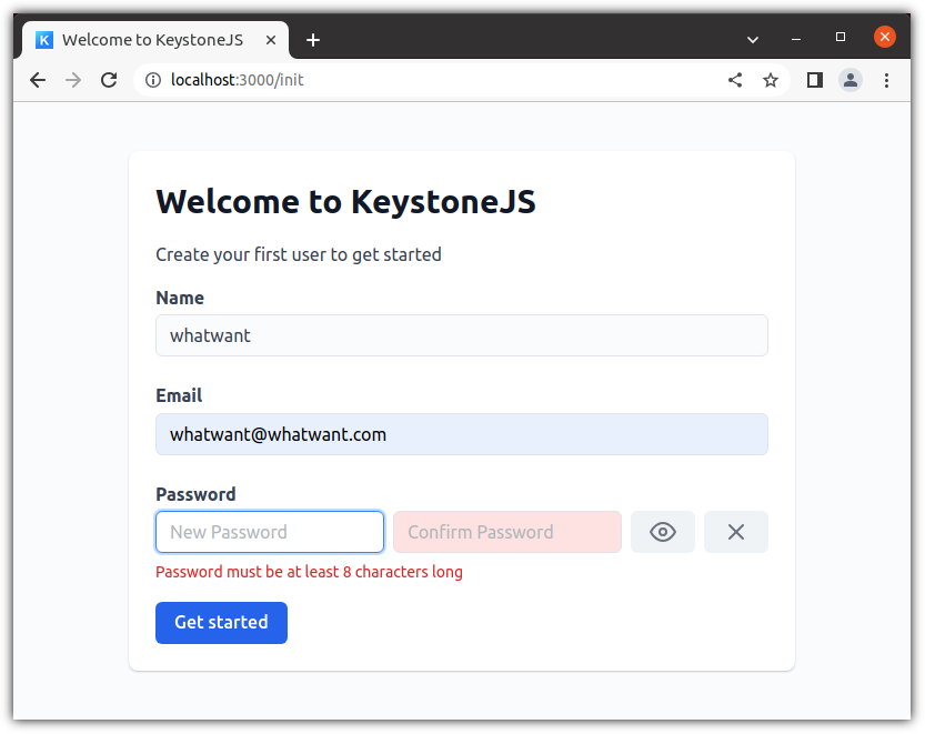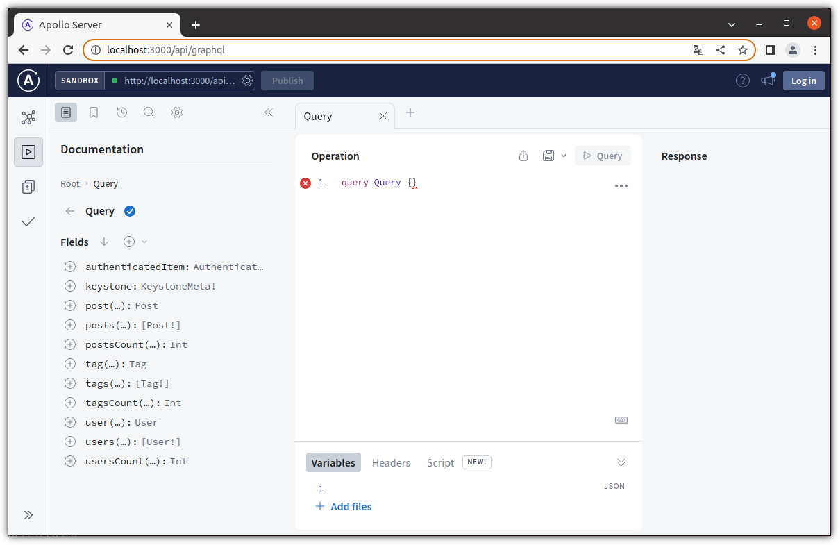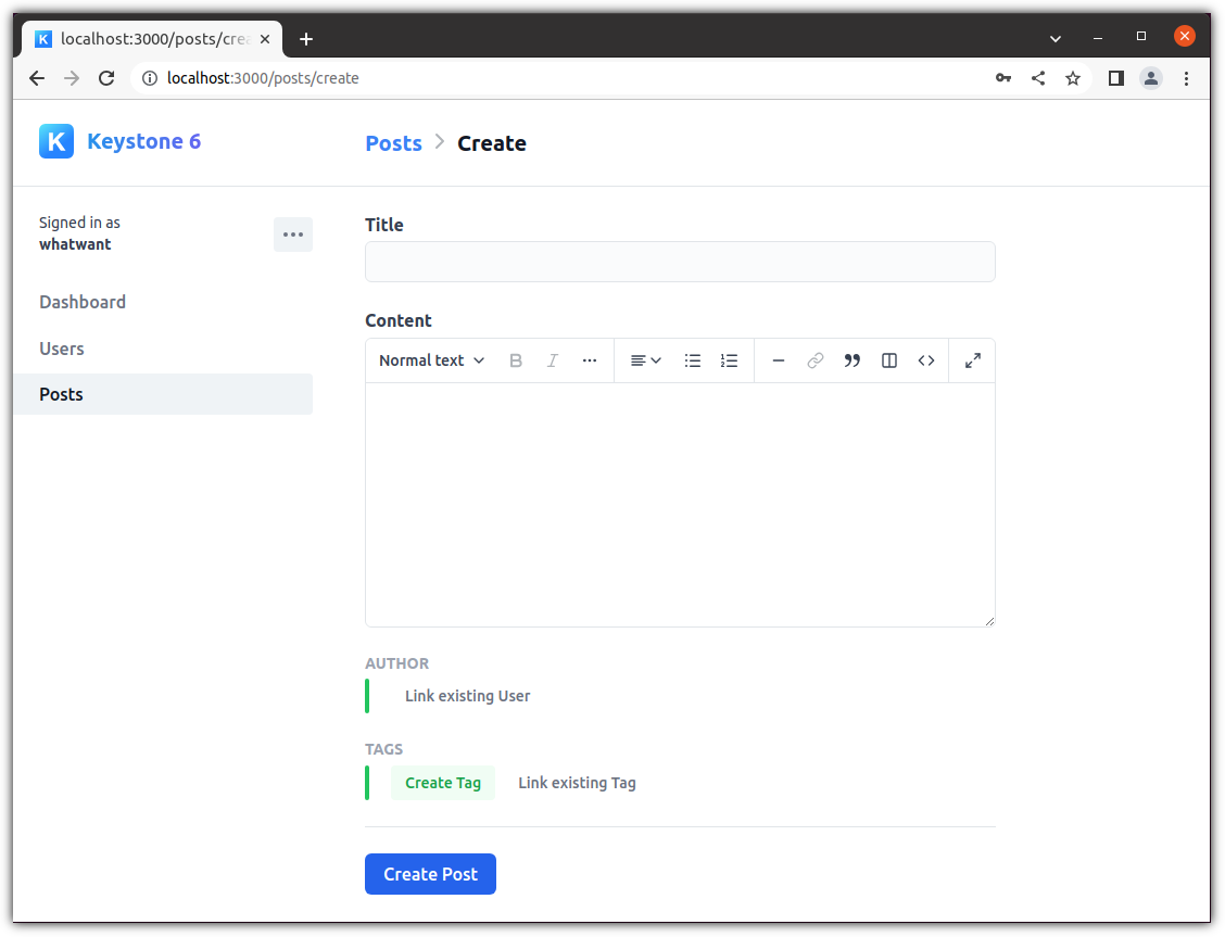 | ❯ mkdir keystone ❯ cd keystone ❯ npm init keystone-app@latest Need to install the following packages: create-keystone-app@9.0.1 Ok to proceed? (y) ✨ You're about to generate a project using Keystone 6 packages. ✔ What directory should create-keystone-app generate your app into? · my-app ⠋ Installing dependencies with yarn. This may take a few minutes. ⚠ Failed to install with yarn. ✔ Installed dependencies with npm. 🎉 Keystone created a starter project in: my-app To launch your app, run: - cd my-app - npm run dev Next steps: - Read my-app/README.md for additional getting started details. - Edit my-app/keystone.ts to customize your app. - Open the Admin UI - Open the Graphql API - Read the docs - Star Keystone on GitHub ❯ cd my-app/ ❯ ls -al 합계 484 drwxrwxr-x 4 chani22 chani22 4096 7월 12 16:28 . drwxrwxr-x 3 chani22 chani22 4096 7월 12 16:26 .. -rw-rw-r-- 1 chani22 chani22 46 7월 12 16:26 .gitignore drwxr-xr-x 2 chani22 chani22 4096 7월 12 16:28 .keystone -rw-rw-r-- 1 chani22 chani22 2874 7월 12 16:26 README.md -rw-rw-r-- 1 chani22 chani22 2710 7월 12 16:26 auth.ts -rw-rw-r-- 1 chani22 chani22 1014 7월 12 16:26 keystone.ts drwxrwxr-x 570 chani22 chani22 20480 7월 12 16:28 node_modules -rw-rw-r-- 1 chani22 chani22 410056 7월 12 16:28 package-lock.json -rw-rw-r-- 1 chani22 chani22 397 7월 12 16:26 package.json -rw-rw-r-- 1 chani22 chani22 9506 7월 12 16:26 schema.graphql -rw-rw-r-- 1 chani22 chani22 1056 7월 12 16:26 schema.prisma -rw-rw-r-- 1 chani22 chani22 5178 7월 12 16:26 schema.ts -rw-rw-r-- 1 chani22 chani22 195 7월 12 16:26 tsconfig.json 3.8.16 chani22@chani22-VBox /srv/workspace/ks/my-app ❯ nano keystone.ts ❯ npm run dev > keystone-app@1.0.2 dev > keystone dev ✨ Starting Keystone ⭐️ Server listening on :3000 (http://localhost:3000/) ⭐️ GraphQL API available at /api/graphql ✨ Generating GraphQL and Prisma schemas ✨ sqlite database "keystone.db" created at file:./keystone.db ✨ Your database is now in sync with your schema ✨ Connecting to the database ✨ Creating server ✅ GraphQL API ready ✨ Generating Admin UI code ✨ Preparing Admin UI app - warn You have enabled experimental feature (appDir) in next.config.js. - warn Experimental features are not covered by semver, and may cause unexpected or broken application behavior. Use at your own risk. - event compiled client and server successfully in 195 ms (18 modules) ✅ Admin UI ready - wait compiling /_error (client and server)... - event compiled client and server successfully in 6.5s (1706 modules) |