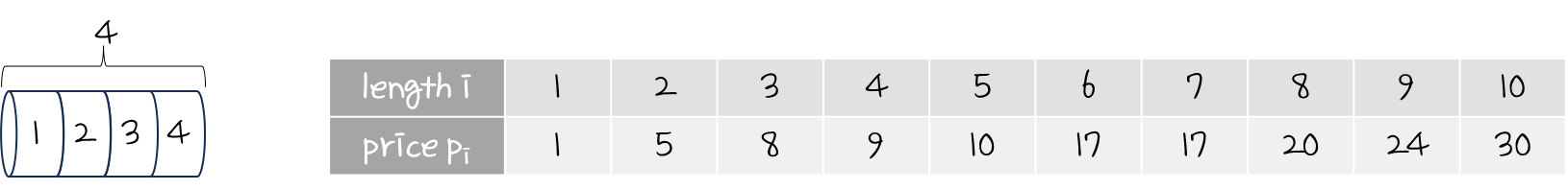 "n = 4" 만큼의 길이를 갖고 있는 막대기가 있고, 길이에 따른 가격은 다음과 같다.