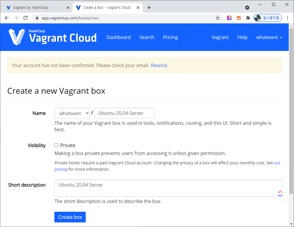 - `03. Vagrant Hub ?`에서 회원가입을 했다면 아래와 같은 화면을 확인할 수 있다.