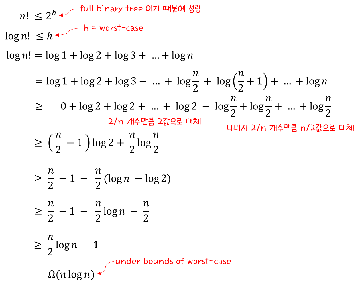 최소한 "n log n" 번 비교를 해야한다는 것에 대한 증명 과정을 살펴보고자 한다.