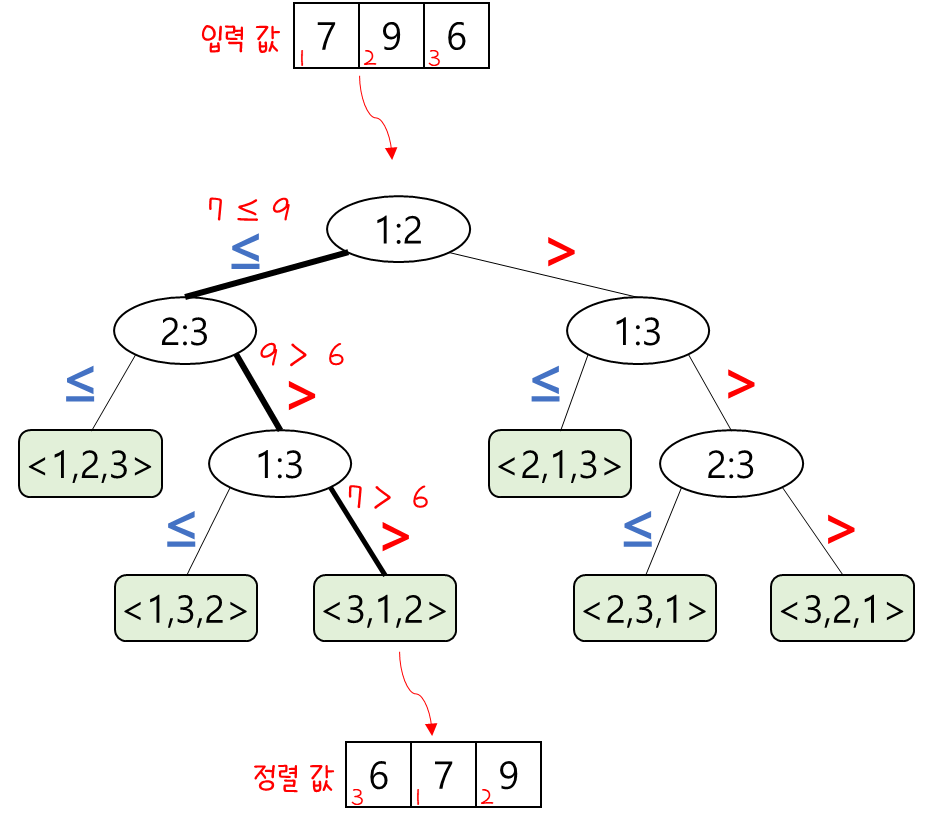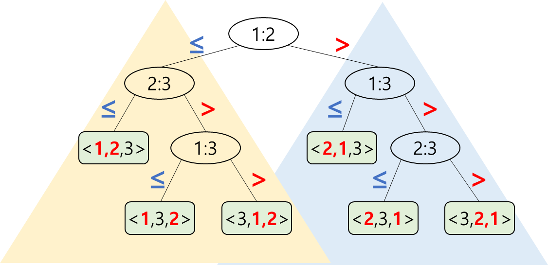 - 입력값 크기가 3인 insertion sort는 다음과 같은 decision-tree model로 표현