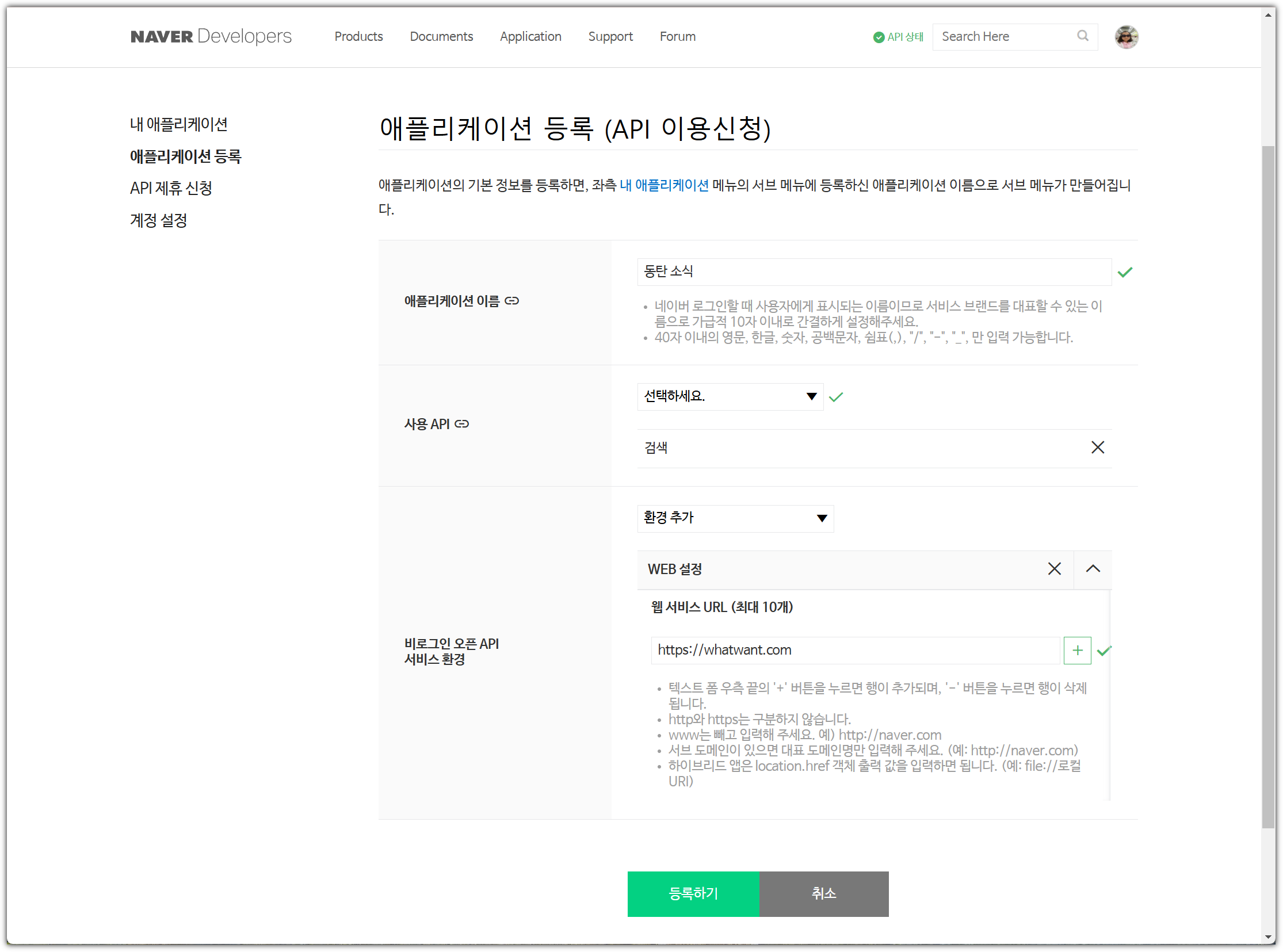 나는 예전에 신청했던 이력이 있어서인지 바로 애플리케이션 등록 창으로 이동되었다.