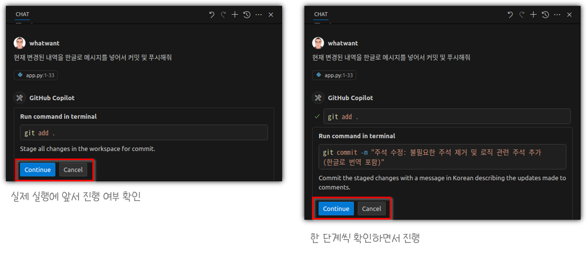 채팅창에서만 동작한 것이 아니라 실제로 'Copilot' 터미널이 열리면서 스스로 동작을 한 것이다.