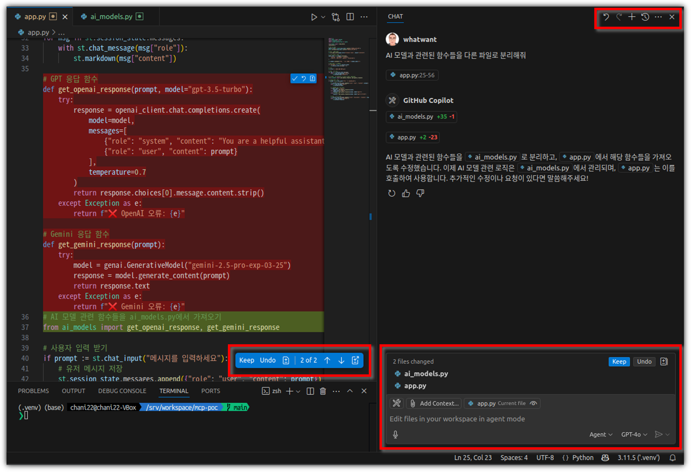 Agent 모드이기 때문에 채팅창을 벗어나 터미널 명령어들을 사용할 수도 있다.
