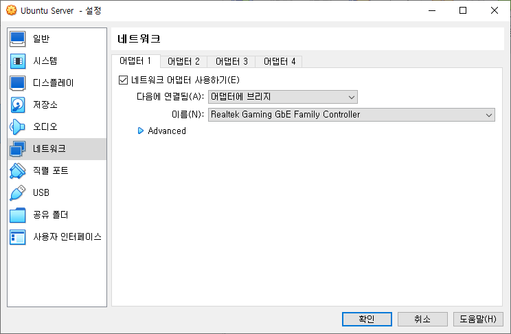 여기에서는 "어댑터에 브리지"를 선택해서 Host와 동일한 레벨에서 IP를 받을 수 있도록 하겠다.