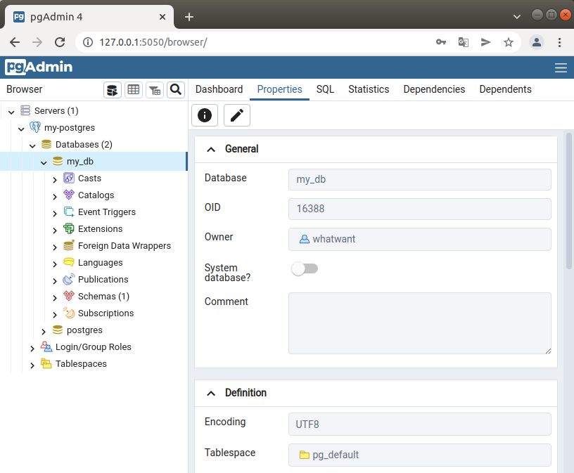 | postgres=# CREATE DATABASE my_db WITH OWNER whatwant ENCODING 'UTF8'; CREATE DATABASE postgres=# GRANT ALL PRIVILEGES ON DATABASE my_db TO whatwant; GRANT |