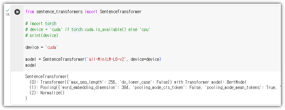 all-MiniLM-L6-v2 모델을 불러왔는데, 출력된 내역을 보면 간단하게나마 spec을 확인할 수 있다.