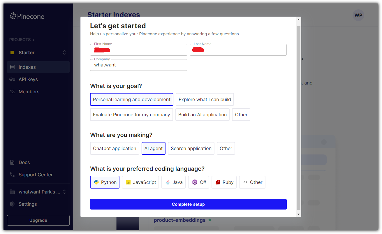 - 앞에서 이미 Pinecone API Key 및 Env 값은 확보(?)했으니 이 부분은 Pass